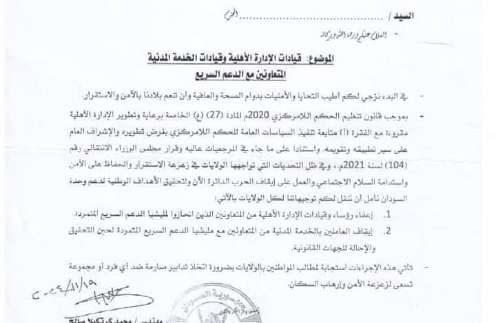 كما نصت الوثيقة على إعفاء جميع رؤساء وقيادات وعمد ورموز الإدارات الأهلية التي تعاونت مع الميليشيا. وأكد الخطاب الذي يحمل توقيع وزير الحكم الاتحادي المهندس محمد كرتكيلا صالح، أن هذه الإجراءات تهدف إلى الاستقرار والحفاظ على الأمن واستدامة السلام الاجتماعي والعمل على إيقاف الحرب الدائرة الآن.
