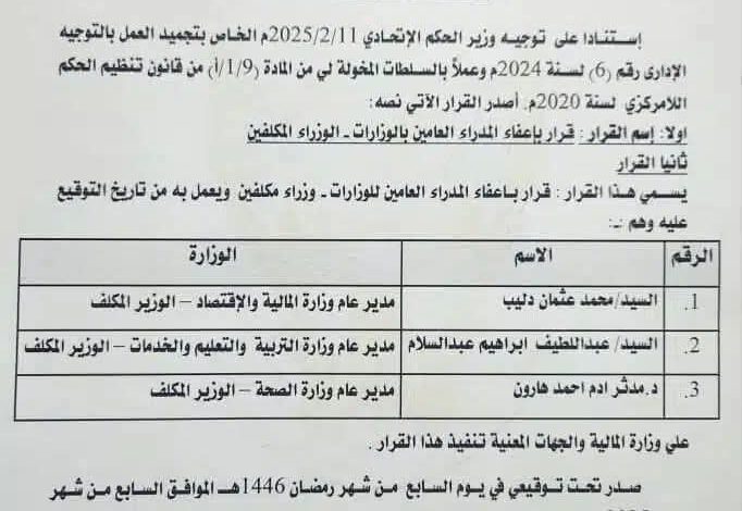 أصدر والي ولاية وسط دارفور، مصطفى تمبور، قرارًا بإعفاء عدد من المسؤولين الحكوميين من مناصبهم بعد التشاور مع وزير الحكم الاتحادي. شمل القرار كلاً من محمد عثمان، مدير عام وزارة المالية والوزير المكلف، وعبداللطيف إبراهيم، مدير عام وزارة التربية والتعليم والوزير المكلف، إضافة إلى د. مدثر آدم هرون، مدير عام وزارة الصحة. ولم يتم الإعلان عن الأسماء التي ستتولى المناصب الشاغرة بعد.