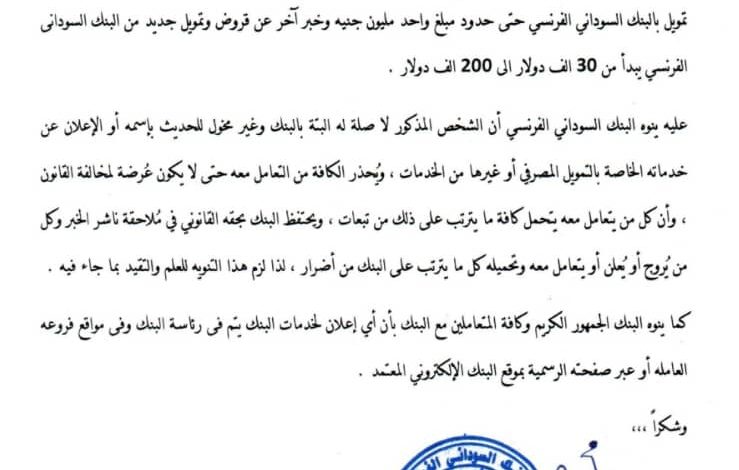 وزع البنك السوداني الفرنسي منشورا تحذيريا ضد المدعو خالد ابوبكر وجاء في المنشور :تلاحظ للبنك السوداني الفرنسي أن شخصا يدعى (دكتور خالد ابوبكر ) قد نشر على حسابه بموقع فيسبوك مفاده أن البنك يمنح تمويلا حتى واحد مليون جنيه ومنشور اخر عن قرض من البنك يبدأ من 30الف دولار وحتى 200الف دولار