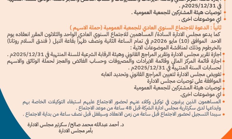 أما الاجتماع الثاني للجمعية العمومية، والمقرر عند الساعة الثالثة عصراً، فسيتناول إجازة القوائم المالية لحملة الأسهم والوثائق، وتفويض مجلس الإدارة لتعيين المراجع القانوني وتحديد أتعابه، فضلاً عن مناقشة توصيات المجلس وانتخاب أعضاء جدد للجمعية العمومية.