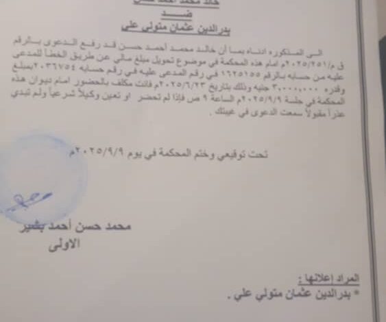 إلى المذكور اعلاه بما أن خالد محمد أحمد حسن قد رفع الدعوى بالرقم / ٢٥/٩٥١ ٢م امام هذه المحكمة في موضوع تحويل مبلغ مالي عن طريق الخطأ المدعى عليه من حسابه بالرقم ١٩٢٥١٥٥ في رقم المدعى عليه في رقم حسابه ٢٠٣٦٧٥٤ مبلغ ره ٢٠٠٠٠٠٠٠٠ جنيه ولك تاريخ ٢٠٢٥/٦/٢٢م كانت مكلف بالحضور امام ديوان هذه المحكمة في جلسة ٢٠٢٥/٩/٢م الساعة 9 ص فإذا لم تحضر أو تعين وكيلاً شرعيا ولم تبدي عذرا مقبولا سمعت الدعوى في عينك.